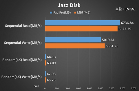 ストレージ速度については、ストレージベンチマーク「Jazz Disk」で計測したところ、iPad ProがMBPに対して、Sequential Readで103%相当、Sequential Writeで94%相当、Random(4K) Readで102%相当、Random(4K) Writeで103%相当というスコアになった。全体的にはiPad Proのほうが好成績だったわけだ。ただし、このぐらいであれば計測誤差の範疇だし、体感できるほどの違いでもないと言える。