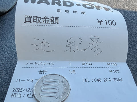 ということでノートPCを渡して待つこと30分、査定を終えて受け取りにいった査定結果は……なんと100円! あのノートPCに値段がついたのだ! 正直、たとえハードオフであっても無料引き取りで終わるだろうと予想していたので、あまりの予想外の査定結果に思わず売ってきてしまった。