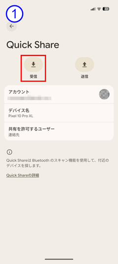 最初は実際の手順の紹介からということで、まずはiPhone→Pixel 10への写真の送信を試してみよう。事前準備として、Pixel 10の側でQuick Shareを開き、「受信」をタップして待受状態にしておく。