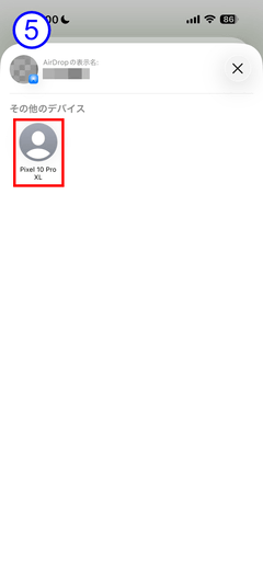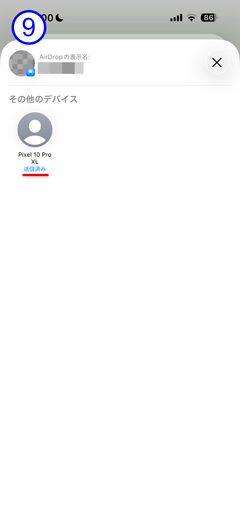 もう1つの組み合わせ、具体的には送信側がPixel 10(Wi-Fiオン)、受信側がiPhone(Wi-Fiオフ)の場合はどうかというと、Pixel 10側からiPhoneを検出でき、送信が行なえる。
