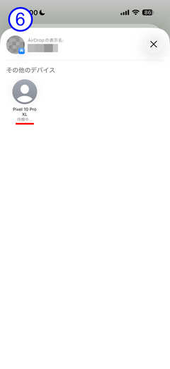 続いてiPhone側で送信したい写真を選択し、共有アイコンをタップ。共有メニューの中から「AirDrop」を選択すると、送信先のデバイスの候補としてPixel 10の名前が表示されるので、アイコンをタップする。表示が「待機中...」となったら、iPhone側の操作はいったんここで完了だ。