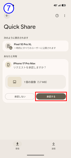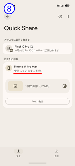 この時点でPixel 10の側では、iPhoneからのリクエストを承認するかを問うダイアログが表示されているので「承認する」をタップ。これにより表示が「受信しています...」を経て「受信しました」へと変わり、写真の送信が完了する。この間、進捗はパーセンテージで表示されるので分かりやすい。