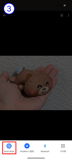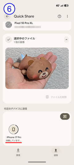 まずPixel 10で送信したい写真を開いて「共有」アイコンをタップし、その中にある「Quick Share」をタップする。Quick Shareが起動して画像のプレビューが表示されるとともに、付近のデバイスが検索され、iPhoneが検出される。アイコンをタップし、表示が「待機しています...」に変わったら、Pixel 10側での操作は終了だ。