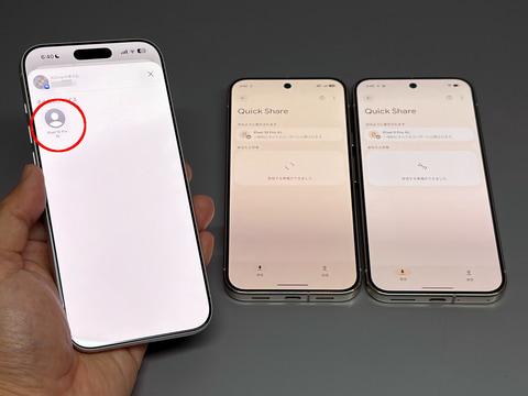 まずiPhoneから送信を行なう場合、送信先として検出できるのはPixel 10だけで、Pixel 9は検出されない。またPixel 9から送信しようとした場合は、送信先に表示されるのはPixel 10だけで、iPhoneは検出されない。いずれも検出はできるものの送信ができないといったレベルではなく、そもそもの検出自体が不可能だ。