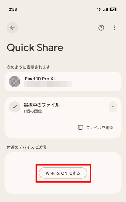 一方で送信側がPixel 10である場合は、Wi-Fiをオフにした時点でQuick Shareが付近のデバイスを検出できなくなるので、「Wi-FiをONにする」というボタンが表示され、検出画面にたどり着かない。Quick ShareもWi-Fiに加えてBluetoothを使う仕組みのはずだが、これを見る限り、Wi-Fiへの依存度が高いようだ。