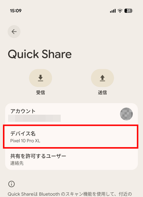 一方でPixel 10については、Quick Shareのホーム画面における「デバイス名」が識別に用いられる。こちらもデフォルトでは「誰々のPixel 10 Pro XL」といった具合に、名前+機種名というフォーマットになっている。前述のiPhoneの名前がほかの用途でも用いられるのに対し、こちらはQuick Shareでのみ使われる専用の名前を付けられるのが違いだ。