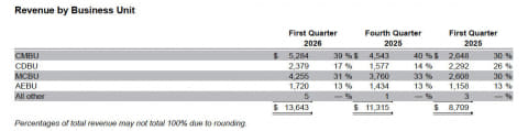 このCDBUの数字でいえば、2025年第4四半期の売上は15億5,700万ドル、営業利益3億9,100万ドルなので粗利益率は24.8%ほど。ところが今季は売上23億7,900万ドルに対して営業利益8億9,000万ドルで、粗利益率は56.4%まで跳ね上がっている。これはCMBUの63.5%にはやや劣るが、MCBUの53.6%とかAEBUの43.7%を凌ぐ優秀な成績だ。