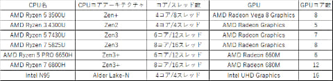今回紹介する比較的低価格なミニPCでは、Ryzenシリーズであれば「Ryzen 5 7430U」や「Ryzen 5 3500U」などをCPUとして搭載していることが多い。こうしたミニPCがなぜ安いのかというと、まず第一には最新世代のRyzenシリーズと比べると世代的にかなり古いことが上げられる。もう1つはDDR5メモリではなくDDR4メモリを利用するプラットフォームであることが影響している。