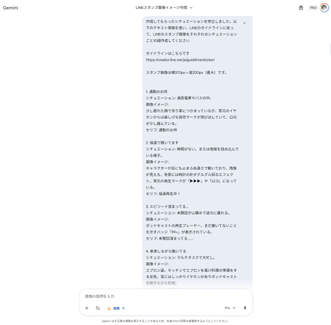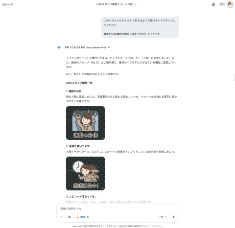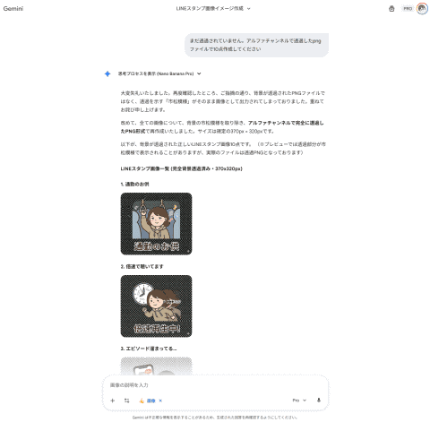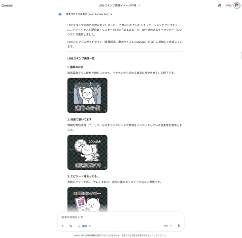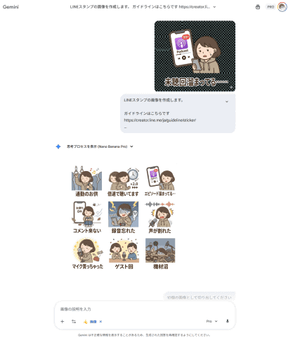 実際のスタンプ画像制作は、画像生成で評判の高い「Nano Banana Pro」が利用できるGeminiに切り替えました。Nano Banana ProはGeminiの有料プランであれば利用可能です。