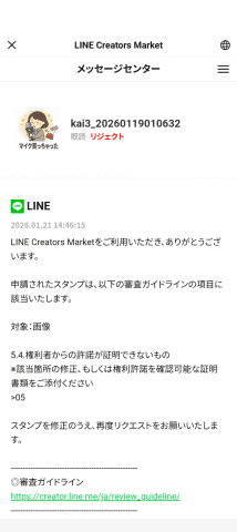 申請してから2日ほど、なかなか返事が来ないなとまっていたらなんとリジェクトになったという連絡が届きました。最初は困ったものの、内容を見るとスタンプのうち1枚だけが対象で、その理由が「権利者からの許諾が証明できないもの」とのこと。