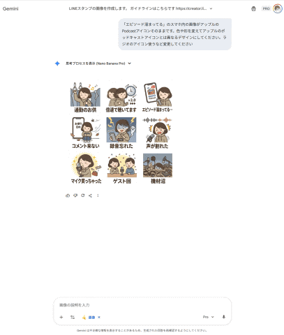 とはいえ最初のアイディアそのものをAIが出してくれるわけではないので、「どんなスタンプを作りたいのかを考えたときに、自分でも配信しつつリスナーとしても楽しんでいるポッドキャストに関するスタンプを作ってみることにしました。