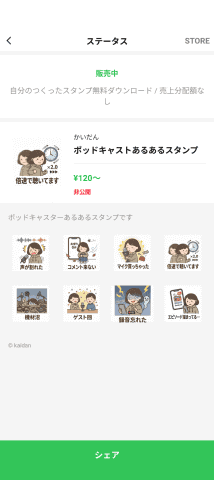 作成したスタンプは公開範囲も指定でき、自分が作成したスタンプを一般向けに販売せず自分だけで楽しむこともできます。ただし、スタンプは最低でも120円からの価格を設定しなければいけないことと、自分が送ったスタンプから相手がそのスタンプを購入することは可能なので、完全に自分だけのクローズドに利用できるわけではありません。