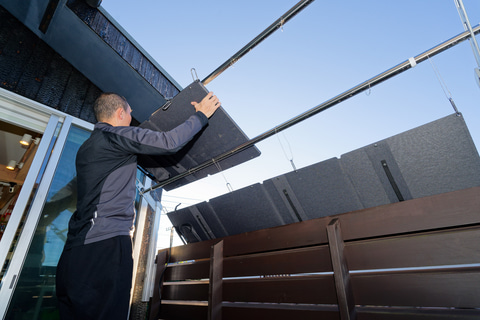 今回は設置・撤去の手間をできるだけ軽減しつつ、最大限に太陽光を受けられるようにするため、ワイヤーやカラビナを組み合わせて物干し竿から吊り下げる形にした。ソーラーパネル1枚あたりの重量は8kg以上、2枚だと16kg超にもなり、これを支えながらの吊り下げ作業はなかなかに大変だった。