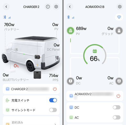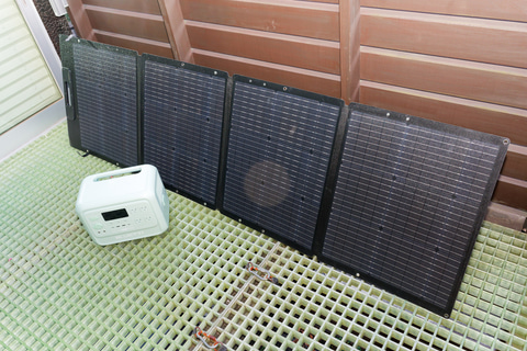 ソーラーパネルは、BLUETTIではより高出力な製品もラインナップしているが、お手頃価格かつ1,024WhのAORA 100 V2を1日で充電しきれるもの、という考え方で200Wの2枚構成、計400Wとした。もし400Wで充電し続けられれば3時間以内に満充電にできる計算だ。ただし、400Wというのはあくまでも理論値みたいなもので、実際の発電量はこれよりも低くなる。それも含め、余裕をみての2枚構成とした。