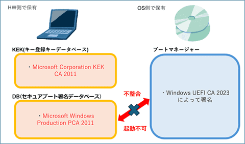 ハードウェア側にあり、更新前に保存されているMicrosoft Corporation KEK CA 2011が2026年6月に有効期限切れとなる - DB(セキュアブート署名データベース):