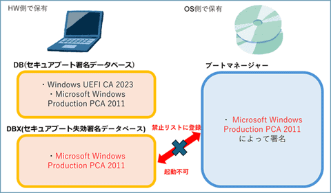 ハードウェア側にあり、更新前に保存されているMicrosoft Windows Production PCA 2011が2026年10月に有効期限切れとなる - DBX(セキュアブート失効署名データベース):