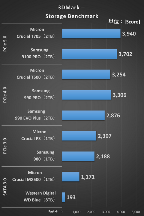 PCIe 5.0/4.0/3.0/SATAのSSDとHDDで比較検証
