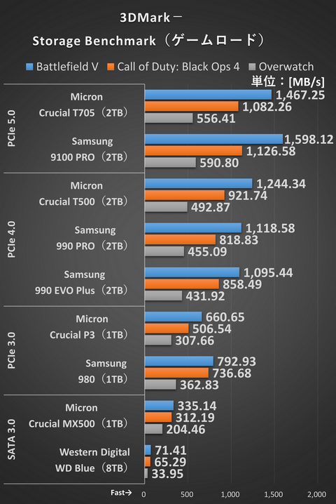 PCIe接続のSSD間では差は小さい。最速のCrucial T705と一番遅いSamsung 980を比較しても1秒も変わらないという結果だ。これもPCMarkにおけるアプリの処理と同じでちりも積もれば……といえる。メーカー間を見ると、Micronの方が優秀だ。アプリの処理ではSamsungが強かったが、ゲーム関連はMicronに軍配が上がることが多いのはおもしろいところ。