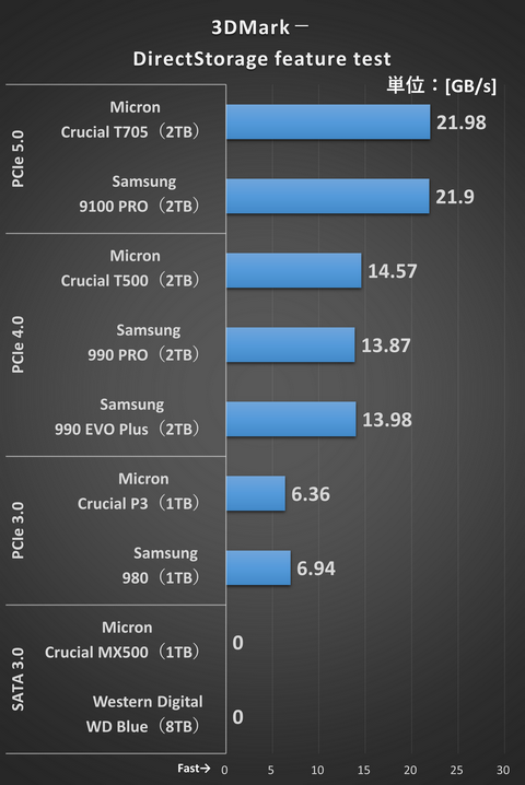続いて、SSDからGPUのビデオメモリにデータを直接転送することでゲームのロード時間を高速化する「DirectStorage」の速度を測定する3DMarkのDirectStorage feature testを試そう。DirectStorageの利用にはPCIe接続NVMe SSDが必要になるため、SATA接続のSSDとHDDはテストに含めていない。