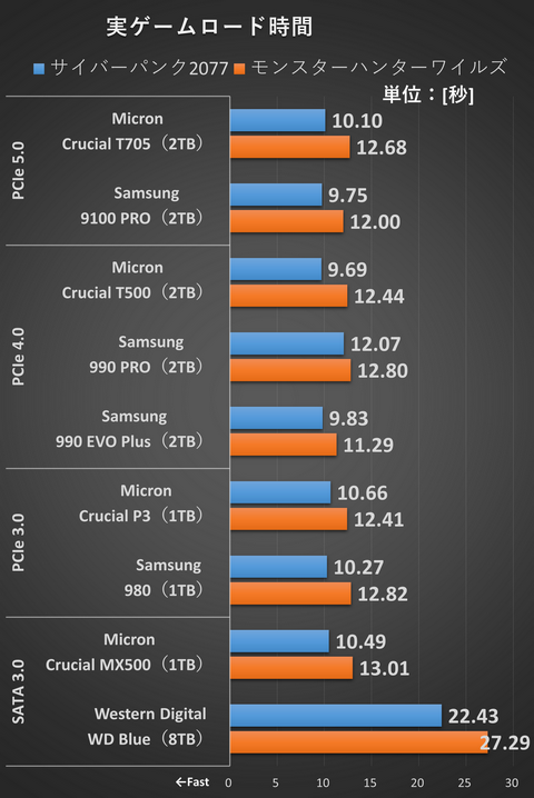 思いのほか差が出なかったというのが正直なところだ。さすがにHDDだと2倍ほどのロード時間になるが、SSDだとSATAを含めてわずかな差になった。なぜなら、筆者が確認する限り、サイバーパンク2077でロード時間は最大でもデータ転送速度は540MB/sほど、モンスターハンターワイルズで460MB/sほどだ。SATA SSDでも対応できる速度なのである。ゲームの保存先としては、SATA SSDやPCIe 3.0のSSDでも不満を感じるケースは少なそうだ。