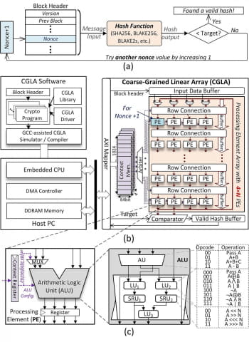 教授の研究室におられるPHAM Hoai Luan助教授が2024年のISOCC(International SoC Design Conference)に出された論文である「CGLA: Coarse-Grained Linear Array for Multi-Hash Acceleration in Blockchain Mining」は、CGLAを使ってブロックチェーンのマイニング用プロセッサを構築したというものである。