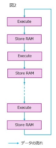 という問題が生じる。これを解決するにはどうするか?といえば、図2のように実行ユニットを縦方向にずらっと並べ、間にRAMを挟むのが一番効率的になる。