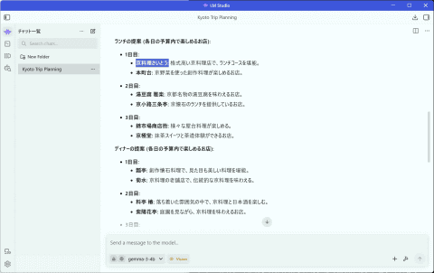 ただし弱点もある。今回は「東京発で京都旅行、日程は三泊四日、ランチの予算は3000円、ディナーの予算は5000円、旅行時期は6月、ホテルは三つ星」というテキストで旅行計画を立ててもらった。ホテルや飲食店について追加の質問を投げると、表示される店の名前やURLが正確ではないものが出てくる。特にURLはほぼ存在しないものを「作って」表示する傾向が強い。