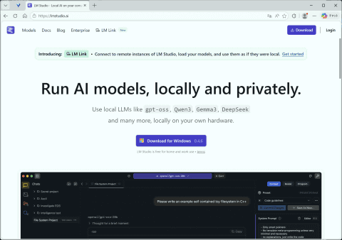 ここからはLM Studioの導入と初期セッティング、簡単なチャットによる推論作業について解説していこう。LM Studioは基本的に商用も含めて無料であり、導入方法や利用方法が分かりやすい。