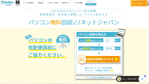 リネットジャパンは環境省/経済産業省から認定を受けた「小型家電リサイクル法」の認定事業者で、対象の中にPCが1つ以上含まれていれば、前述のTVなど4品目を除いた小型家電を無料回収してくれる。表向きは「本来は有料のところキャンペーンにつき無料」という形を取っているが、実質的に常時無料といっていい太っ腹ぶりだ。