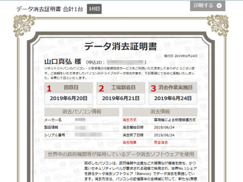 そのためリネットジャパンでは、有償でデータ消去サービスを用意している。このサービスを使うと、ストレージ内のデータを消去(物理破壊を含む)した旨証明書が発行されるので安心だ。特に他人のPCを代理で処分するような場合は、このサービスを利用しておけば、トラブルに発展するリスクを減らせる。ちなみに料金は1台3,498円となっている。