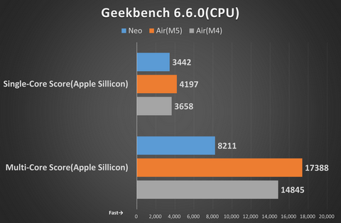 Geekbench 6のMulti-Core Scoreで比較すると、Air(M5)はNeoの約212%相当、Air(M4)の約117%相当のスコアを記録したことになる。M5はCPU性能を着実に向上しているといえる。