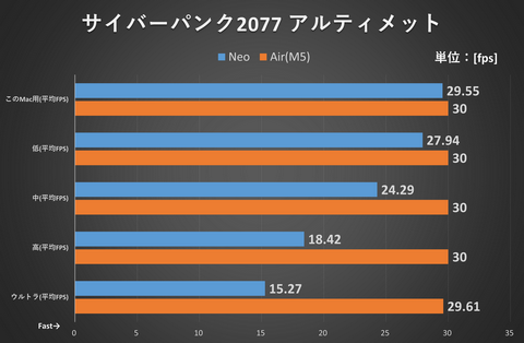 最後のベンチマークとして「サイバーパンク2077アルティメット」を実行してみた。現行の3Dアクションゲームとしてはかなり重たい部類に入るが、インストール時に初期設定される「このMac用」というプリセットであれば、Neoは平均29.55fps、Air(M5)は平均30fpsで動作した。