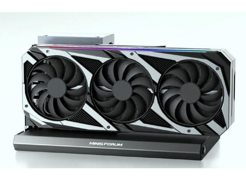 もう1つのGPUドックは、市販されている自作PC向けのビデオカードを、ノートPCやミニPCで利用するための機器だ。薄型のスタンドに自作PC用のマザーボードでよく見る「拡張スロット」を搭載しており、ここにビデオカードを挿す。ビデオカードには電源を供給する必要があるが、そのために電源ユニット用のスペースを設けるモデルや、電源ユニット自体を内蔵するタイプもある。