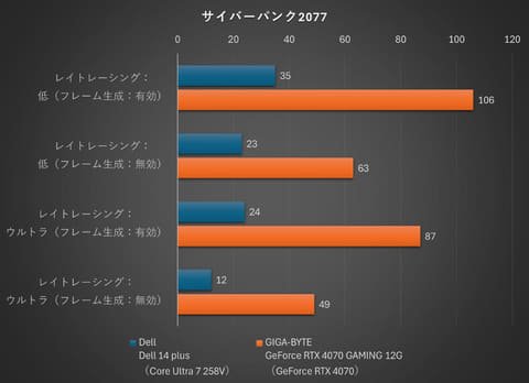 また実際の3Dゲームではどういった状況になるのかを、サイバーパンク2077のベンチマークテストで検証したのが下のグラフだ。解像度はノートPCのモニターに合わせて2,560×1,440ドット、グラフィックスの設定は「レイトレーシング: 低」と「レイトレーシング: ウルトラ」の2つ。Core Ultra 7 258Vの内蔵GPUとGeForce RTX 4070ではフレーム生成機能を利用できたので、その有無についても検証した。