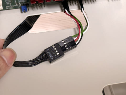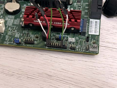 早速組み立てをしていこう。CPUやメモリ、SSDの取り付けについては割愛させていただくが、注意するポイントはSupermicroのマザーボードは前面のスイッチやLEDの配線が今のマザーボードと異なるため、ケースがせっかく一体型コネクタを採用しているものの、アイネックスのピン配列変換ケーブルを使用しなければならない点。なお、2ピンは別で使用したためHDDのLEDのみ接続していない。