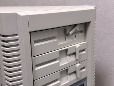 まずは「FLP02」について簡単に説明しよう。これはレトロ風タワー型のPCケースで、本体色も最近のケースでは見ないアイボリーとなっている。また、5インチベイが3つあり、そのカバーが5インチFDDのようなデザイン。電源スイッチやファンのターボモードなど1990年代風を漂わせつつも、前面USB Type-Cや360mm水冷ラジエータに対応など最新のトレンドやパーツも対応できるようになっている。