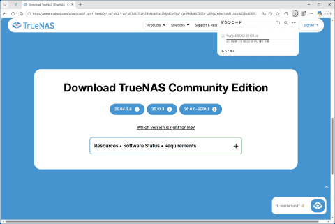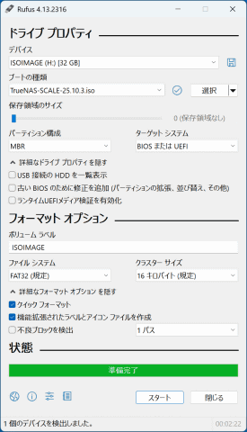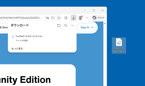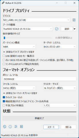Webサイトの上部にある[Products]をクリックしてドロップダウンメニューを表示し、下段右にある[TrueNAS Community Edition]のバナーをクリックしよう するとTrueNAS Community EditionとEnterpriseで機能を比較できるWebサイトに移動する。下にスクロールして[Download community Edition]というボタンをクリックする 次のページでもスクロールして、[No Thanks,I've Already Signed Up.]というボタンをクリックする。この画面は簡単にいえばコミュニティサイトへの勧誘だが、ボタンの内容は「もう加入済みなのでダウンロードサイトに行きたいです」という意思表示だ ダウンロードできるTrueNAS Community Editionのバージョンが表示される。左は安定版、中央は最新版、右はベータ版となり、今回は最新版の[25.10.3]ボタンをクリックする TrueNAS Community Editionのセットアップ用ISOファイルがダウンロードできた 次に、ダウンロードしたISOファイルをUSBメモリに書き込み、セットアップ用USBメモリを作る。起動可能なブータブルUSBメモリにしないといけないので、そういったブート領域を作ってくれるアプリを使って書き込みを行なう。今回は筆者が使い慣れている「Rufus 4.13」を利用した。Rufusはこちらからダウンロードできる。