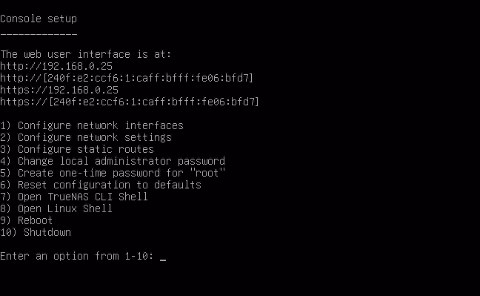テキストベースで古いタイプのUEFIを搭載しているPCやマザーボードの場合、WTR PROと同じ方法でUSBメモリからPCを起動できることが多い USBメモリから起動すると自動でセットアップ画面が表示される。[Install/Upgrade]にカーソルを合わせてEnterキーを押す 利用できるストレージのリストが表示される。間違いを防ぐため、今回はOS用のSSDのみを組み込んでいるため、ストレージは1つしか表示されない。ここでスペースキーを押して[※]と表示されていることを確認してEnterキーを押す 指定したドライブのパーティションやデータが消えてしまうことなどの警告が表示される。<Yes>をクリックする 別のPCからWebブラウザ経由でアクセスする時に利用するアドミニストレーター(管理者)アカウントを設定する。特に変更は必要ないので[truenas_admin]のままで[OK]を選択してEnterキーを押す truenas_adminアカウントのパスワードを設定する。上下の入力欄に同じパスワードを入力し、[OK]にカーソルを移動してEnterキーを押すと、TrueNASのセットアップが開始される しばらく待つとセットアップが終了してこの画面が表示される。セットアップ用USBメモリを抜いて[OK]の状態でEnterキーを押すと12の画面に戻るので、[Reboot System]を選択した状態でEnterキーを押すとPCを再起動する 再起動後、各種の初期化作業を行なった後にTrueNASが利用できるようになる。別のPCからWebブラウザ経由でアクセスするためのIPアドレスが上から3段目に表示されるので(今回は192.168.0.25)メモしておく 初期設定を行なってファイル共有機能を有効化する