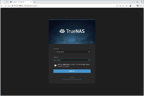 いったんシャットダウンしたら、ファイル共有で利用する3.5インチHDDをWTR PROに組み込もう。その後WTR PROのTrueNASを起動してしばらく経つと上の画面になる。その後、ほかのPCからWebブラウザ経由で上の画面で確認できるIPアドレスを打ち込むと、ユーザー認証画面が表示される。最初にユーザーインターフェイスを日本語化し、TrueNASの共有フォルダを利用するユーザーを登録するところまでを手順を追って解説する。