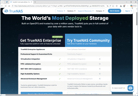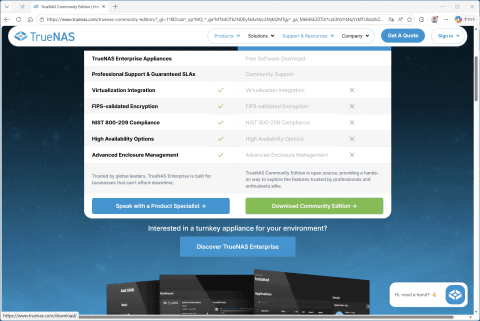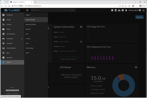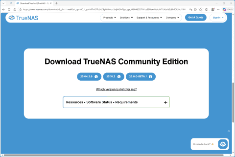 Enterpriseは企業向けの有償サポートや高度な暗号化機能、統合的な仮想化機能などをサポートするが、一般ユーザーにはあまりなじみのない機能なのでTrueNAS Community Editionでも充分過ぎる ちなみにTrueNAS COREは現在も利用可能だが、今後は機能強化は行なわず、メンテナンスモードに入るとiXsystemsはアナウンスしている。そのため無償で利用できる一般ユーザー向けのTrueNASは、TrueNAS Community Editionが主流になると考えてよいだろう。今回の検証でも、TrueNAS Community Editionの「25.10.3」を利用した。