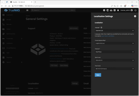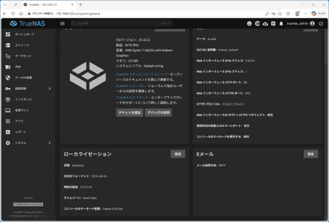 ユーザー認証画面では、ユーザー名に先ほど設定したアドミニストレーターアカウント「truenas_admin」とパスワードを入力し、[ログイン]ボタンをクリックしよう するとTrueNASの状態をまとめて表示する「ダッシュボード」が表示される。表示はすべて英語で、PCを使い慣れたユーザーならなんとなく意味は分かる。とはいえTrueNASは日本語対応なので、設定から日本語化していこう 左に並ぶ[System]タブをクリックして表示されるメニューから[General Settings]をクリックする [General settings]の画面。ここで左下の「Localization」の[setting]ボタンをクリックする すると右側からメニューが表示されるので、[Language]のメニューから[Japanese(ja)]、[Timezone]を[Asia/TOKYO]に変更して[save]ボタンをクリックする ユーザーを登録するには右のメニューにある[認証情報]→[ユーザー」とクリックする するとユーザーの管理画面を表示する。右上にある[追加]ボタンをクリックしよう [ユーザー名]の欄にユーザーアカウント、[パスワード]/[パスワードの確認]にパスワードを入力し、アクセス許可で[SMBアクセス]にチェックが入っていることを確認して、下にスクロールすると表示される[保存]ボタンをクリックする ユーザー画面に、先ほど設定したユーザー名の[rtakeuchi]が追加されていることが分かる 次にストレージの設定と共有フォルダの作成を行なう。TrueNASでは、複数のストレージを「プール」と呼ばれるかたまりとしてまとめて扱う機能を装備する。NASメーカーの専用OSやWindows 11の記憶域でも、ほぼ同じ機能をサポートしている。
