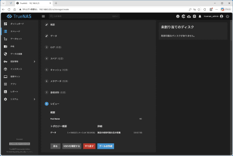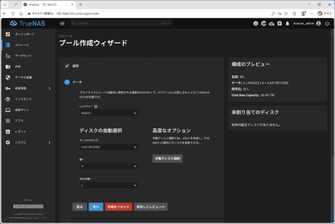 プールに組み込むストレージの台数や、それぞれのストレージに対してどういった方式でアクセスするか、そうしたストレージのプールをいくつ作るかなどもTrueNASから設定できる。今回は3.5インチHDDを4台組み込んでいるので、ストレージが1台壊れても復旧できるRAID Z1設定のプールを1つ作る。