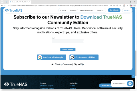 まずはTrueNASのセットアップ用ISOファイルをダウンロードし、Rufusなどブート用USBメモリを作れるツールを使ってセットアップ用のUSBメモリを作る。ちなみにTrueNASのWebサイトからTrueNAS Community Editionをダウンロードするには、結構複雑な手順をたどる必要がある。
