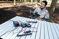 午前のフィールドでのプレイを終え、アウトランダーPHEVの元に戻る。戻ったらさっそく午後のプレイに備えてバッテリの充電だ。ちなみにトイガンにはバッテリ駆動の電動ガン、代替フロンを使うガスガン、ポンプを手動で操作するコッキングガンなどがある。