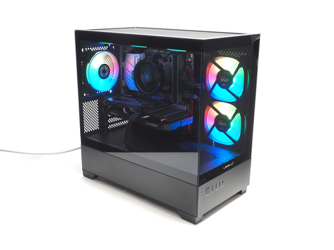 まずは外観をご覧いただこう。ピラーレスとは、前面および左側板の合わさる部分の柱(ピラー)を排し、左側面、前面の2面をガラスパネルとしたデザインだ。PC内部がより見渡せるようになり、CPUクーラーやビデオカードの造形をより楽しめる。そしてそこにARGB LEDのライティングも加わる。ゲームプレイ中はもちろん、インテリアとしてもムードを高めてくれる。剛性は大丈夫かと心配される方もいるかもしれないが、そこは問題ないレベル。多少負荷をかけたところでたわみはしない。