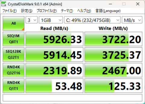 最後にストレージ性能をCrystalDiskMarkで計測した結果も見てみよう。シーケンシャルリードは5,926.33MB/s、同ライトは3,722.20MB/sだった。PCI Express 4.0 x4接続のNVMeではまずまず高速タイプと言えるだろう。PCI Express 4.0 x4世代でもさらに高速な7GB/sクラスに交換するオプションもあるので、容量・速度で求めるスペックにカスタマイズしよう。