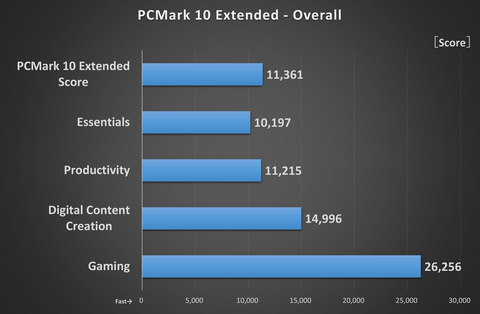 PCMark 10 Extendedスコアは11,361ポイント。ホーム用途、ビジネス用途、デジタルコンテンツ制作想定のシナリオでそれぞれ10,000ポイントオーバーのスコアを記録している。特にデジタルコンテンツ制作、そして最大スコアがゲーミングというところは本製品の特徴をよく示している。