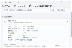 15.6型の内蔵ディスプレイは非光沢仕様の液晶パネルを採用。画面解像度はフルHD(1,920×1,080ドット)で、リフレッシュレートは144Hz。内部的にはCPUの内蔵GPU(iGPU)「Intel UHD Graphics」経由で接続されており、可変リフレッシュレートが有効になっていた。