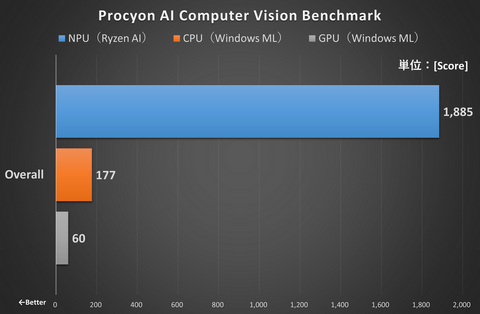 圧倒的にNPUが高スコアだ。しかも、「HWiNFO Pro」での値ではあるが実行時の消費電力はNPUは1~2Wほど、CPUが20~44Wなので電力効率も高い(GPUの消費電力はHWiNFO Proで確認できなかった)。もちろん、ベンチマークなので目安でしかないが、NPUのポテンシャルの高さは見える。