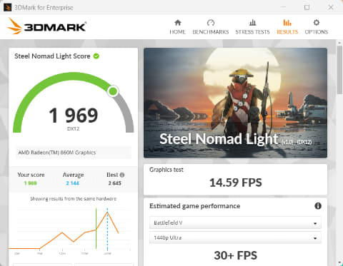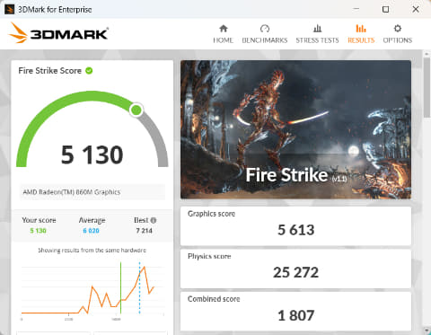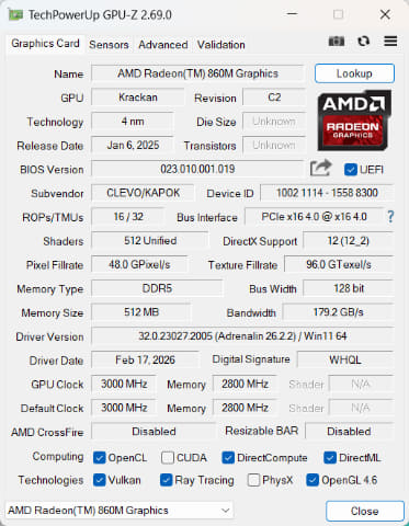 グラフィックス機能はCPU内蔵の「Radeon 860M」を使用している。GPUコアとなるCU(Compute Unit)は8基とそれほど多くはないので、フルHD解像度で画質を抑えめにすればゲームを楽しめるレベルと思っておこう。それでもCPU内蔵型としては高性能だ。